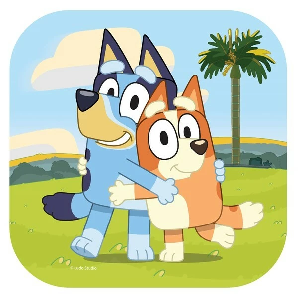 Set an imaginative themed birthday table with square paper lunch plates featuring Bluey. Bingo and Bluey are sharing a lovely hug in the middle of this plate. Serve lunch or snacks to fans of Bluey on these convenient disposable party plates.