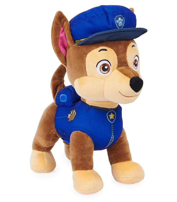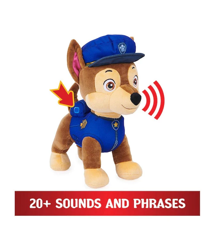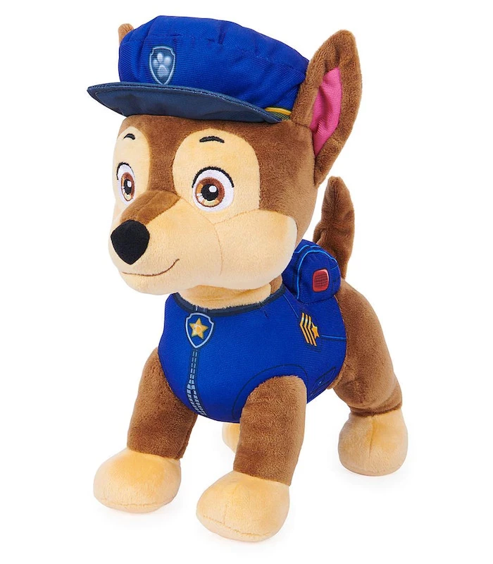 Standing at over 12” inches tall, with super soft fur and a sweet expressive face, Chase comes to life with a combination of over 20 sounds, English phrases, music and tail wagging movement so he’s always ready to join you in your adventures! This PAWsome plush toy is the perfect companion for playtime adventures and nap time dreaming! When it’s time for an exciting rescue mission, simply press on his backpack, to activate his many features, then use your imagination to relive all your favourite adventures from the hit series, like the Mighty Pups and the PAW Patrol Movie, or engage in exciting teddy bear play with all the PAW Patrol pups, like Marshall, Skye, Rubble and Zuma, over and over again! PAW Patrol action figures, toy cars, playsets and stuffed animals are the perfect toys for boys and girls, so race to the ruff ruff rescue with the Interactive Talking Chase and help save the day in Adventure Bay!